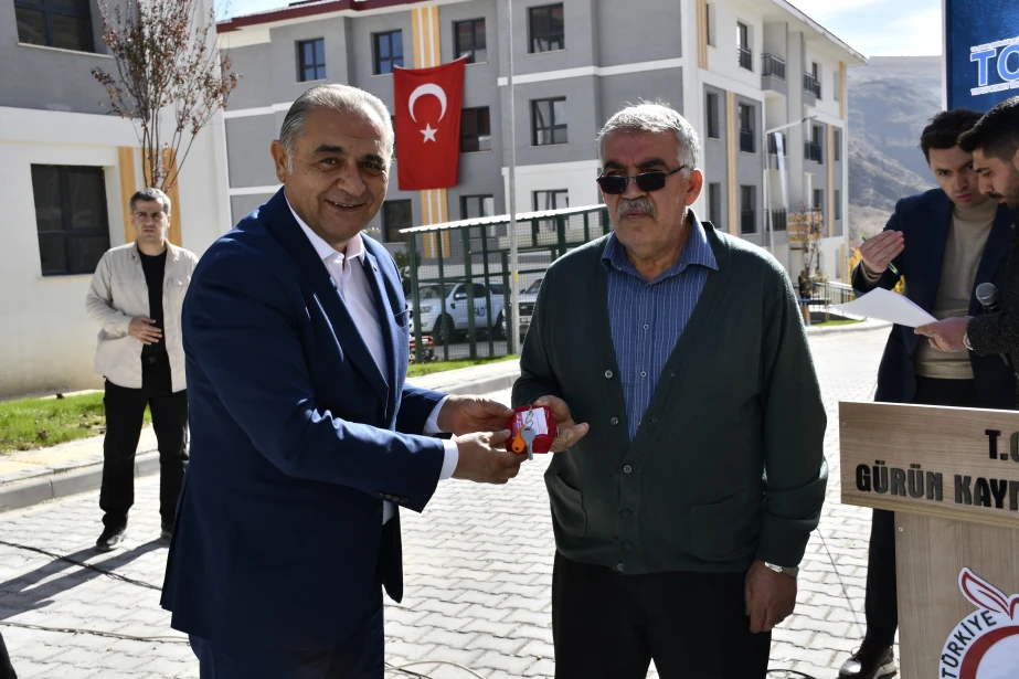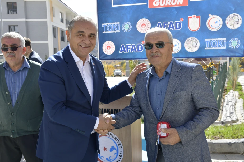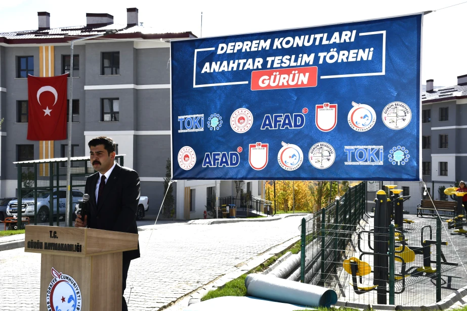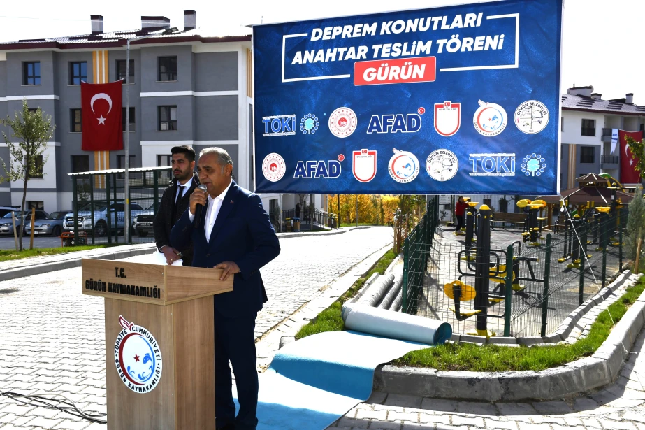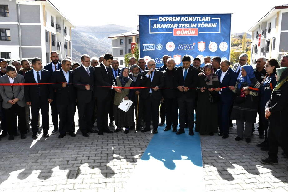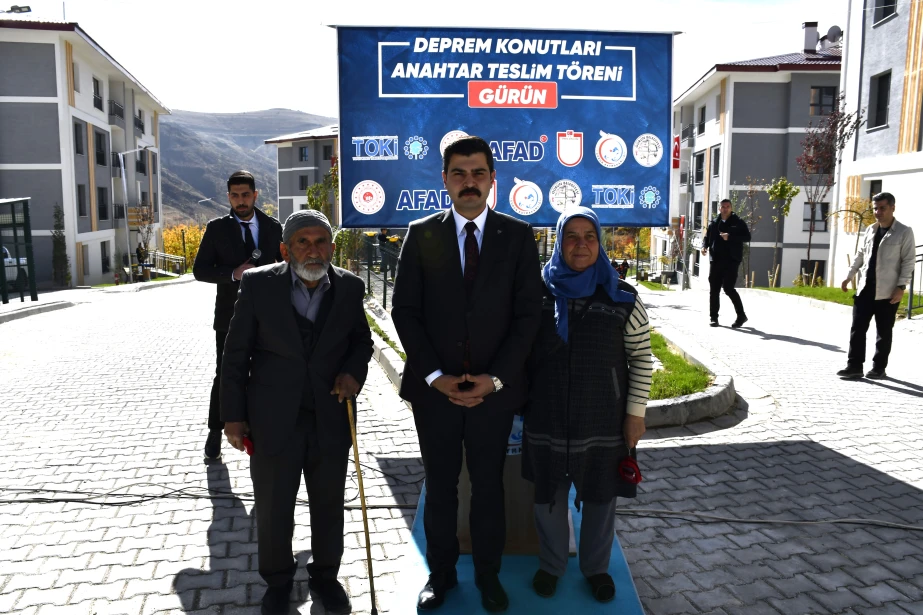 6 Şubat 2023 tarihinde meydana gelen Kahramanmaraş merkezli depremlerden etkilenen Gürün’de, deprem sonrası inşa edilen 1. Etap Deprem Konutları (85 konut ve 1 Görevli Dairesi) hak sahiplerine teslim edildi. Suçatı Çörten Mahallesi’nde yapılan teslimat törenine Sivas Valisi Yılmaz Şimşek, T.C. Ulaştırma ve Altyapı Bakan Yardımcısı Hemşerimiz Osman Boyraz, Gürün Kaymakamı Selami Alper Özkan, Belediye Başkanımız Nami Çiftçi, kurum amirleri, siyasi parti ve sivil toplum kuruluşu temsilcileri ile vatandaşlar katıldı. Programda konuşan Başkan Çiftçi, afetin yaralarının devletin güçlü desteğiyle sarıldığını söyleyerek yeni konutların ailelere hayırlı olması temennisinde bulundu. Devlet millet el ele bu süreci birlik içerisinde atlatıldığını belirten Başkan Çiftçi, Cumhurbaşkanımız Sayın Recep Tayyip Erdoğan başta olmak üzere, konutların hak sahiplerine teslim edilmesinde emeği geçen herkese teşekkür etti. Sivas Valisi Yılmaz Şimşek, Ulaştırma ve Altyapı Bakan Yardımcısı Hemşerimiz Osman Boyraz ve Gürün Kaymakamı Selami Alper Özkan’da anahtarlarını teslim alan vatandaşların mutluluğuna ortak olarak, devletin her zaman milletinin yanında olduğunu vurguladı. Törenle birlikte depremden etkilenen vatandaşlar, yeni konutlarına kavuşmanın sevincini yaşadı.