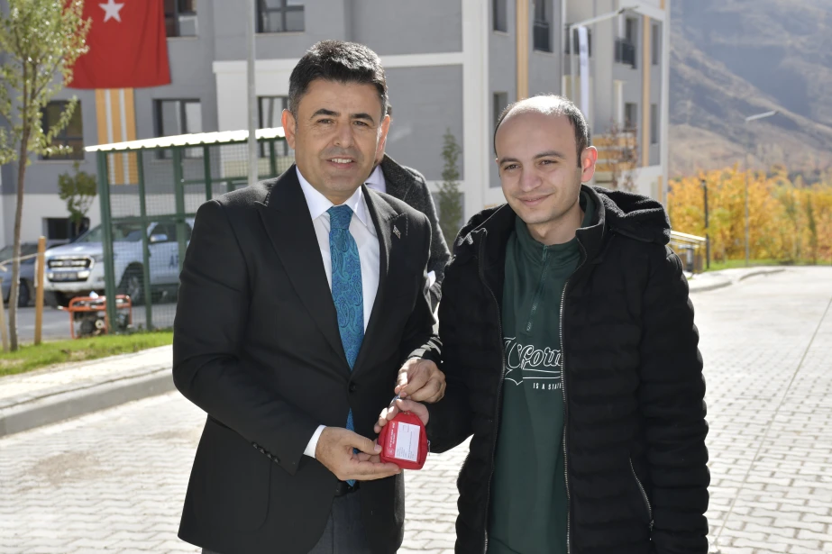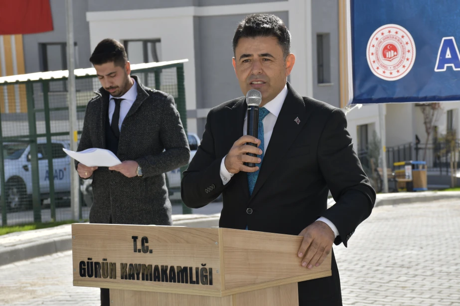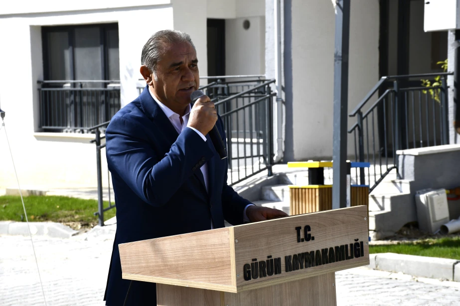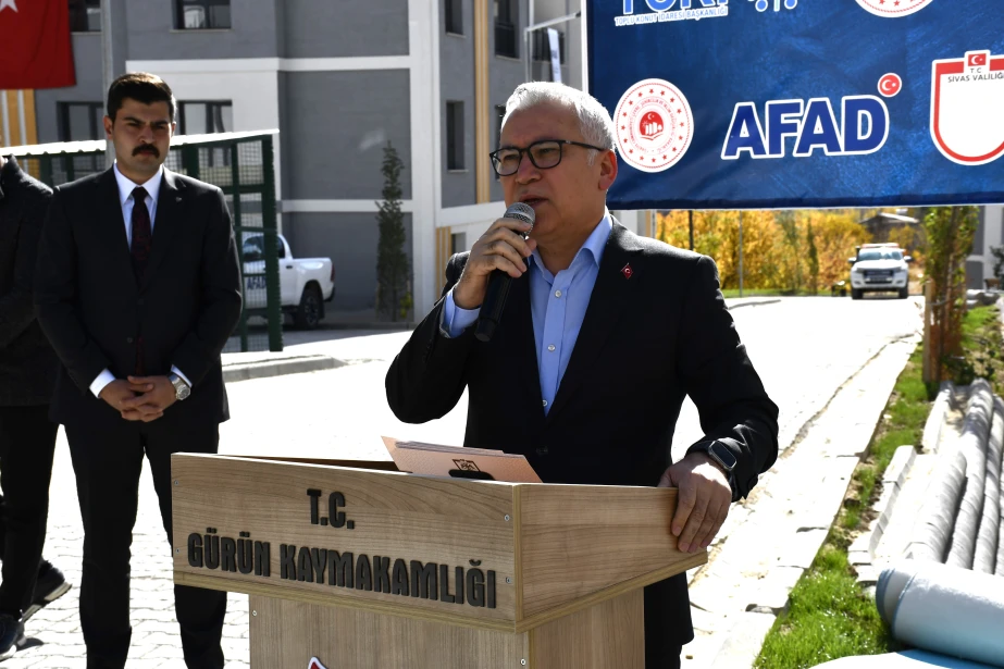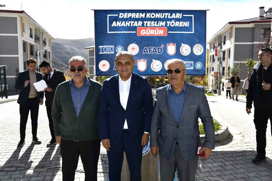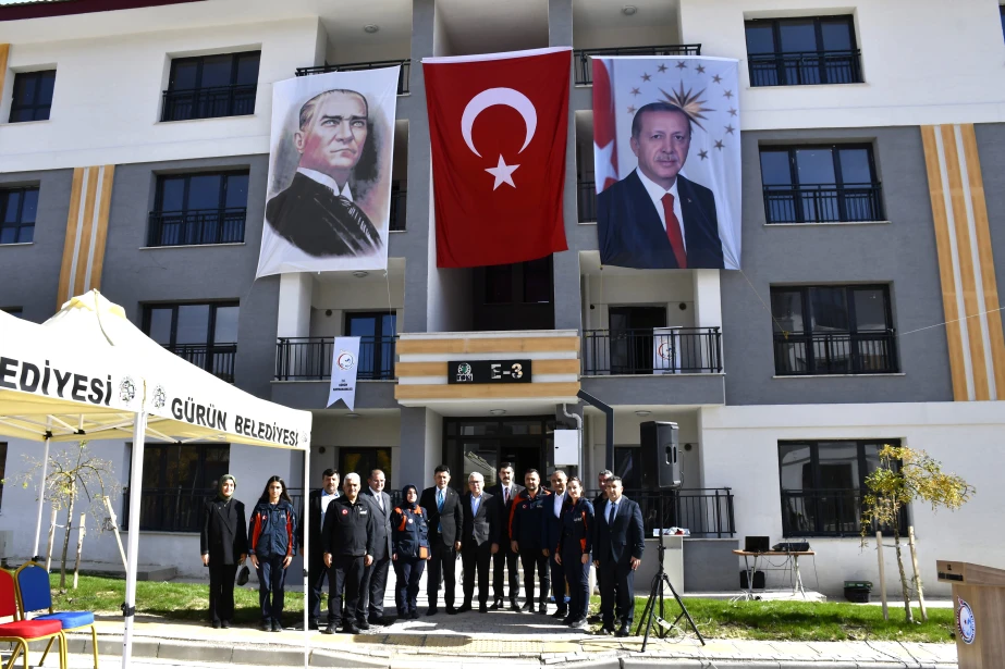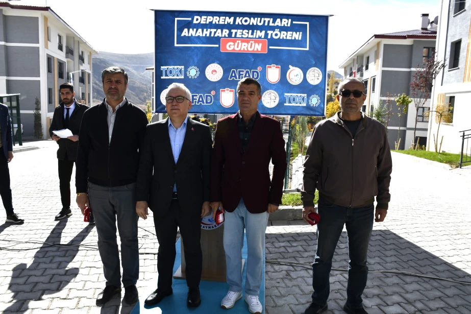 6 Şubat 2023 tarihinde meydana gelen Kahramanmaraş merkezli depremlerden etkilenen Gürün’de, deprem sonrası inşa edilen 1. Etap Deprem Konutları (85 konut ve 1 Görevli Dairesi) hak sahiplerine teslim edildi. Suçatı Çörten Mahallesi’nde yapılan teslimat törenine Sivas Valisi Yılmaz Şimşek, T.C. Ulaştırma ve Altyapı Bakan Yardımcısı Hemşerimiz Osman Boyraz, Gürün Kaymakamı Selami Alper Özkan, Belediye Başkanımız Nami Çiftçi, kurum amirleri, siyasi parti ve sivil toplum kuruluşu temsilcileri ile vatandaşlar katıldı. Programda konuşan Başkan Çiftçi, afetin yaralarının devletin güçlü desteğiyle sarıldığını söyleyerek yeni konutların ailelere hayırlı olması temennisinde bulundu. Devlet millet el ele bu süreci birlik içerisinde atlatıldığını belirten Başkan Çiftçi, Cumhurbaşkanımız Sayın Recep Tayyip Erdoğan başta olmak üzere, konutların hak sahiplerine teslim edilmesinde emeği geçen herkese teşekkür etti. Sivas Valisi Yılmaz Şimşek, Ulaştırma ve Altyapı Bakan Yardımcısı Hemşerimiz Osman Boyraz ve Gürün Kaymakamı Selami Alper Özkan’da anahtarlarını teslim alan vatandaşların mutluluğuna ortak olarak, devletin her zaman milletinin yanında olduğunu vurguladı. Törenle birlikte depremden etkilenen vatandaşlar, yeni konutlarına kavuşmanın sevincini yaşadı.